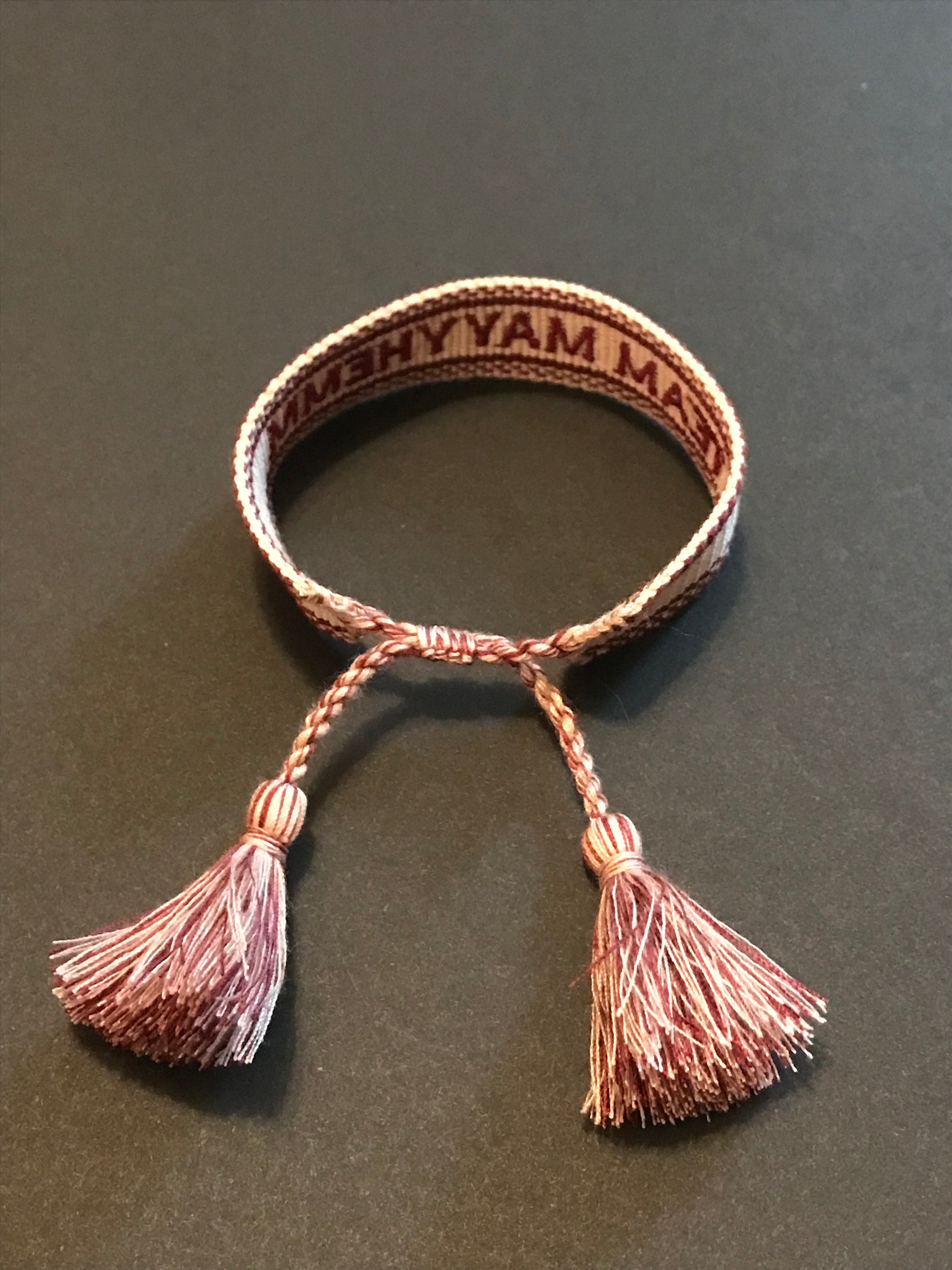 Red variant includes scarlet letters and border on a peach-tan background, and an adjustable tassel closure.